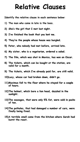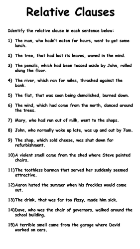 All worksheets only my followed users only my favourite worksheets only my own worksheets. Some of the worksheets displayed are relative clauses work 1, relative clauses work, relative clauses, relative pronouns, defining relative clauses, name date grammar quiz relative clauses. Defining relative clauses these describe the preceding noun in such a way to distinguish it from other nouns of the same class. Sometimes you need a defining relative clause (i.e. Relative clause worksheets to print relative clauses are a type of subordinate clauses, used to provide explanation or information related to the accident, event or idea discussed previously.